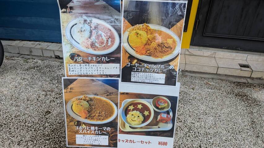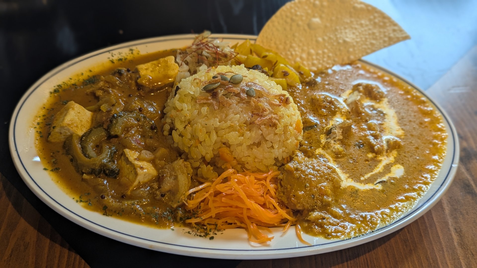 メニューを見てみると、バターチキンカレー、ゴーヤーチャンプルーのココナッツカレー、ゴボウと鶏キーマのスパイスカレーから選べて、あいがけもできるらしい。