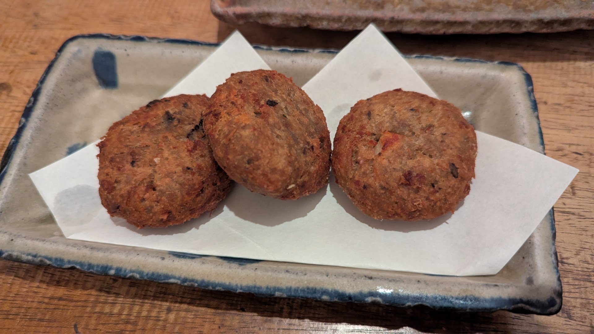 まずは、ドゥル天。「ドゥルワカシー」という田芋を使った琉球料理に衣をつけてあげた田芋のコロッケみたいな感じ。なんとこのドゥル天、うりずんが発祥だそうで、これは食べなきゃということでいただきました!外はカリカリ、中はホクホクで田芋の甘味としいたけや豚肉の旨味が効いていて美味しかったです!