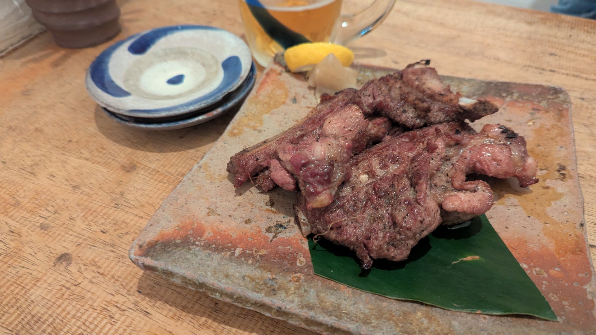 こちらは、県産豚のソーキの塩焼き。ソーキはあばら部分のお肉です。塩加減が絶妙でビールに合う!