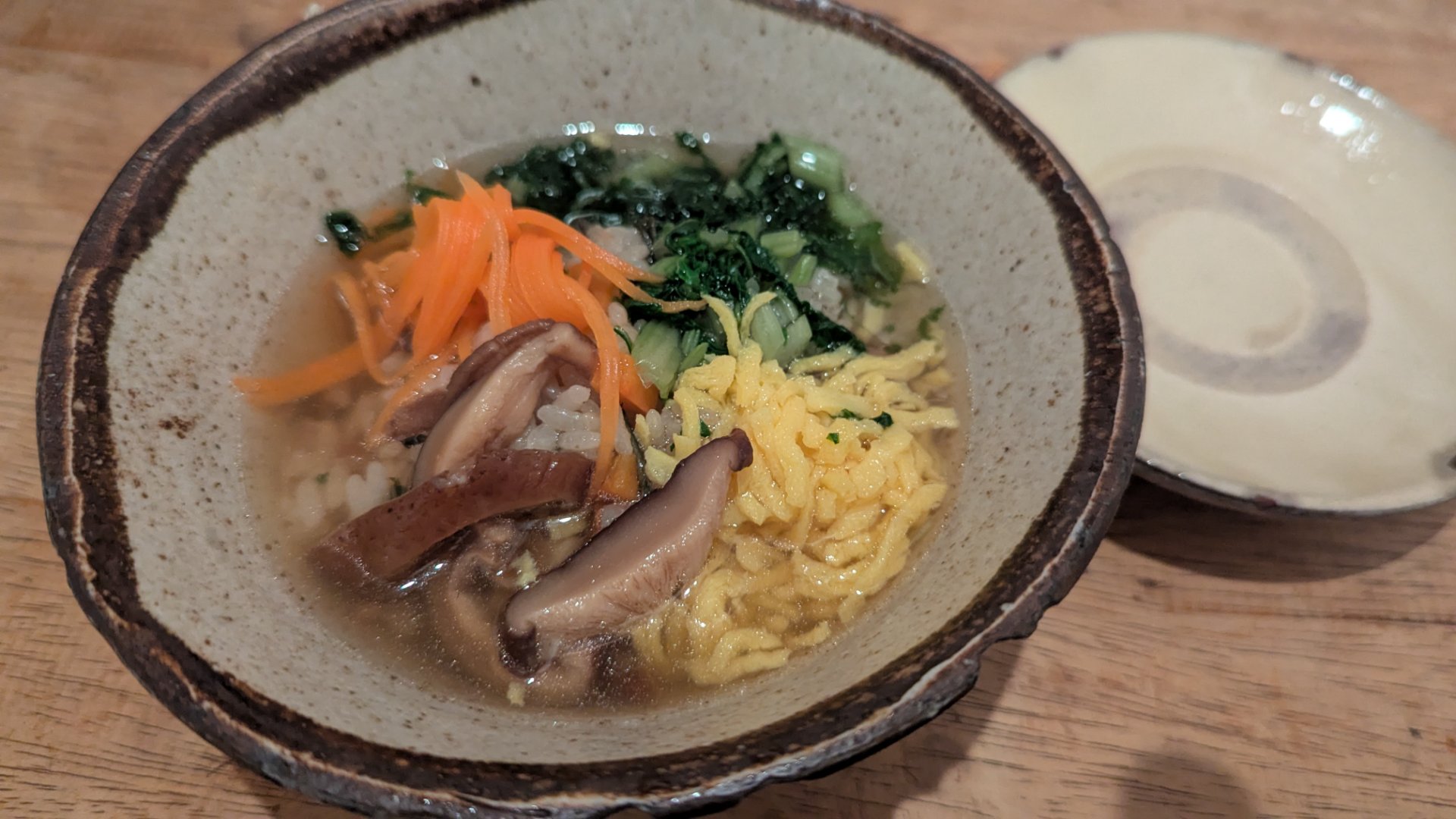 ごはんの上にしいたけやニンジンなどの具材を乗せてかつお出汁をかけたものです。お茶漬け的な感じですね。琉球王朝時代は宴の締めに出されていたものなので、ぜひ最後の締めにどうぞ♪