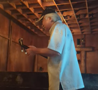 そんな感じで酒盛りを楽しんでいると、突如三味線を弾きながらおじーが登場。