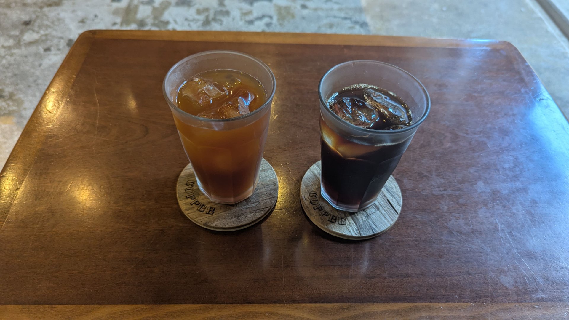 フレンチプレスコーヒーは紅茶とコーヒーの間のような不思議な味。美味しかったです。 もう一つのネルドリップアイスコーヒーは味もしっかりで雑味がなく香りも良く、これもめちゃくちゃ美味しい!こだわりのコーヒーという感じがしました。
